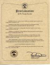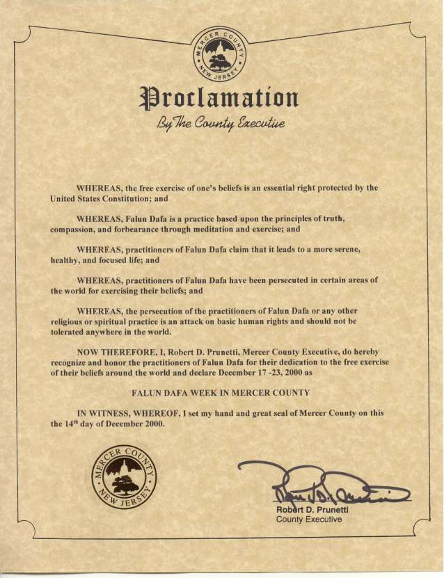 因此,我,罗伯特.D.普鲁尼提,莫瑟郡的执行长官,赞认和嘉奖法轮大法修炼者,由于他们坚持自己的信仰,并在世界范围内提供免费服务活动的贡献,我宣告,二零零零年十二月十七日至二十三日为