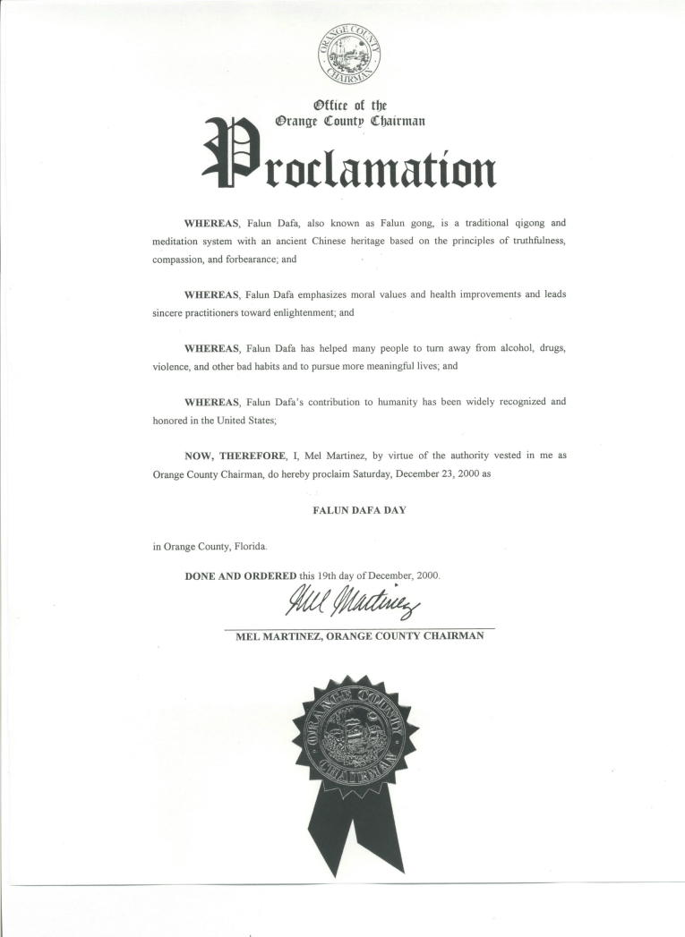 【明慧网2000年12月29日】 佛罗里达州桔子县宣布2000年12月23日为“法轮大法日”。
