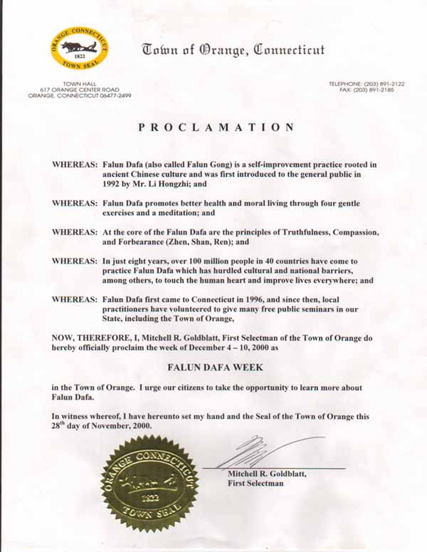 【明慧网2000年12月31日】康涅狄格州橘子镇宣布2000年12月4日至10日为“法轮大法周”