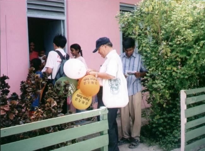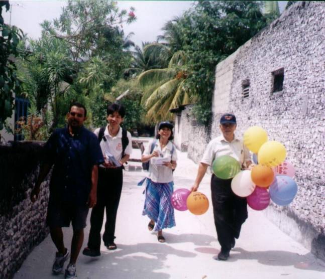 在渔村小岛,许许多多的孩子蜂拥着来拿印有法轮大法字样的气球,他们天真地跟我们学说:“法轮大法、法轮大法。”并高兴地将传单及小日历卡拿给家人。