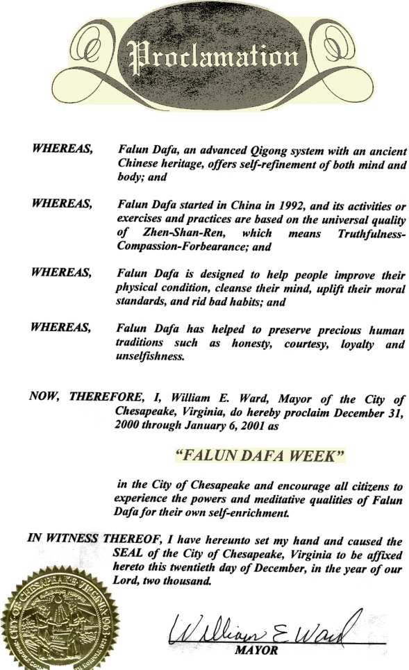 【明慧网2000年12月31日】 弗吉尼亚州奇萨皮科市宣布2000年12月31日至2001年1月6日为“法轮大法周”
