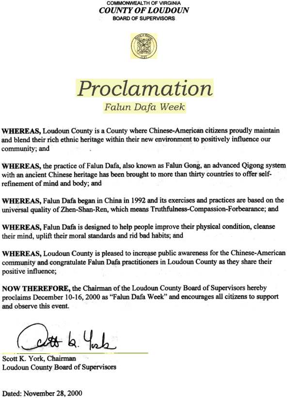 【明慧网2000年12月31日】 弗吉尼亚州劳当郡宣布2000年12月10日至2000年12月16日为“法轮大法周”