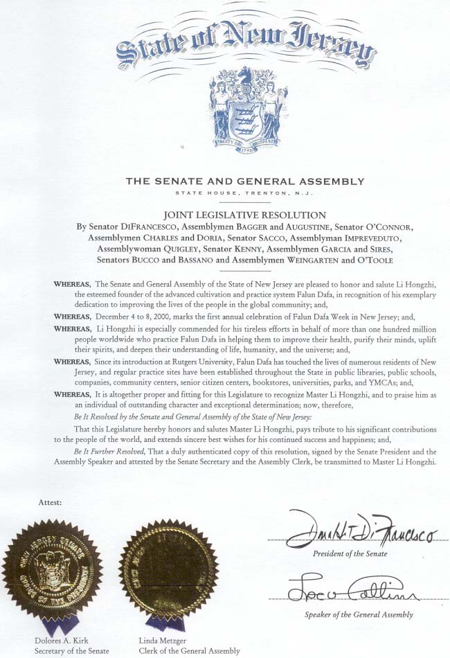 鉴于,新泽西州参议院和众议院高兴地向法轮大法这一高级修炼系统的创始人--令人尊敬的李洪志嘉奖和致意,以表彰他在改善全世界人民的生活方面的出色奉献精神;并且,