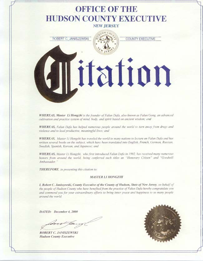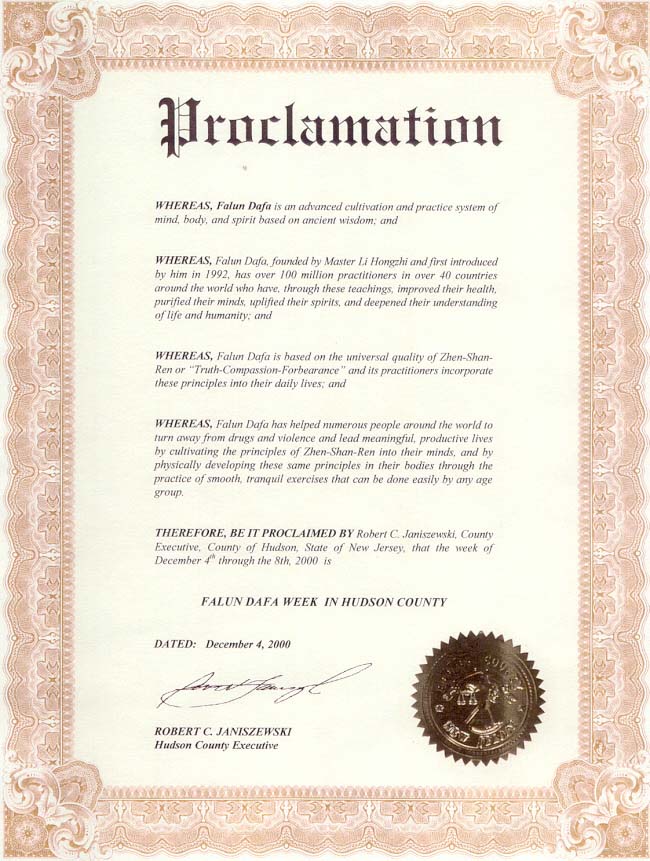 近日,新泽西州哈德逊(Hudson)县行政执行官Janiszewski先生发布公告,宣布2000年12月4日至8日为哈德逊县的“法轮大法周”。在公告中,Janiszewski先生赞扬了法轮大法帮助全世界上亿的人民改善了健康,净化了思想,提升了心灵,加深了对生命,人类及宇宙的认识;同时,通过修炼“真善忍”,法轮大法帮助了全世界众多的人民远离了毒品和暴力,从而过上了充实而有意义的生活。