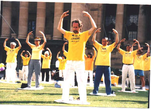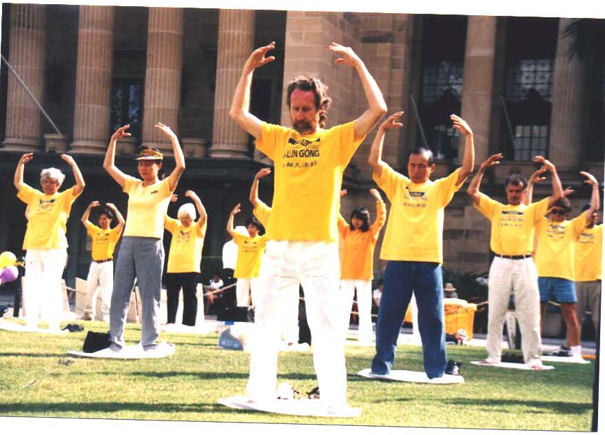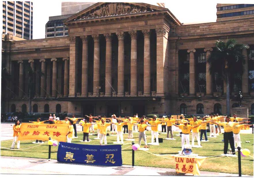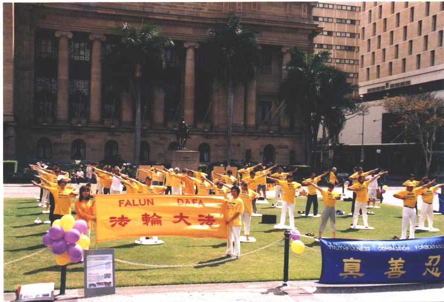 从下午二时至四时,来自昆省各地的近七十名法轮功学员,身穿醒目的黄色T恤衫,排着整齐的队列随着英文解说和祥和的大法音乐向游人过客演示了法轮功的五套功法。场地周围悬挂着印有“法轮大法好”“真-善-忍”字样的横幅和彩球,并陈列着有关法轮大法及在中国境内邪恶势力对无辜法轮功学员残酷镇压迫害的图片和资料。场地上的气氛庄严祥和,与都市中心的繁华热闹形成鲜明的对比,格外引人注目。不少游客停下步来聆听解说,观看学员们的演示;携带照相机的纷纷拍照留念;有的游客干脆拾阶而坐,聚精会神地从头看到尾。中间休息时,一些游人主动向学员们询问功法,索取资料;还有两三个行人被眼前的场景深深感动,当即加入了学员们的行列,第二天又前往新农场(New Farm)的炼功点继续学功学法。