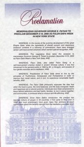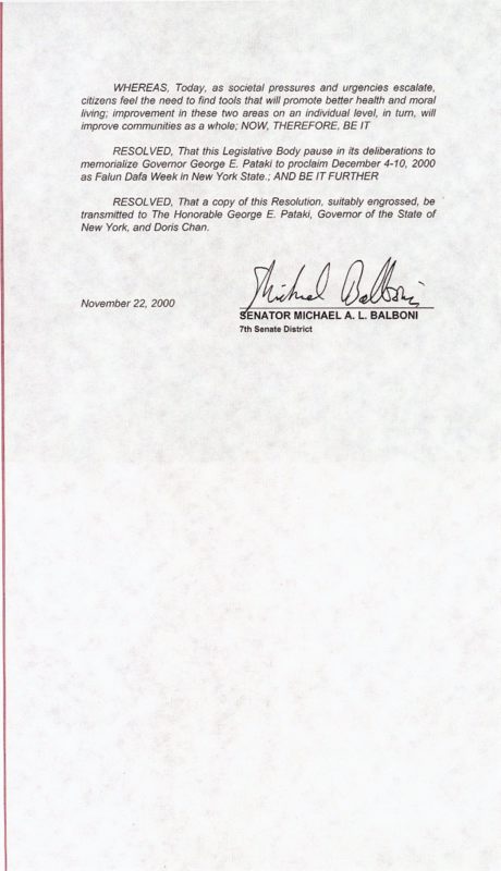 公布,本立法机构经慎重考虑,建议乔治.伯塔奇州长宣布两千年十二月四号至十号为纽约州法轮大法周;