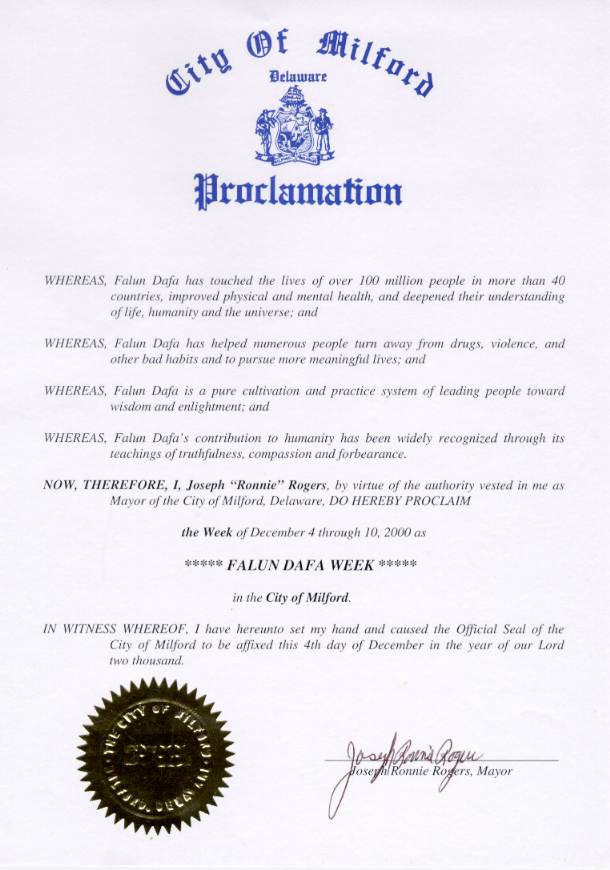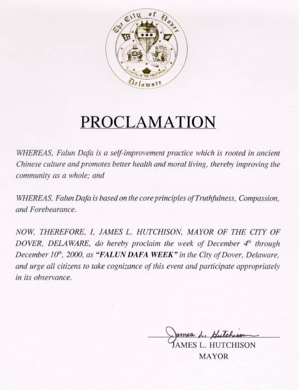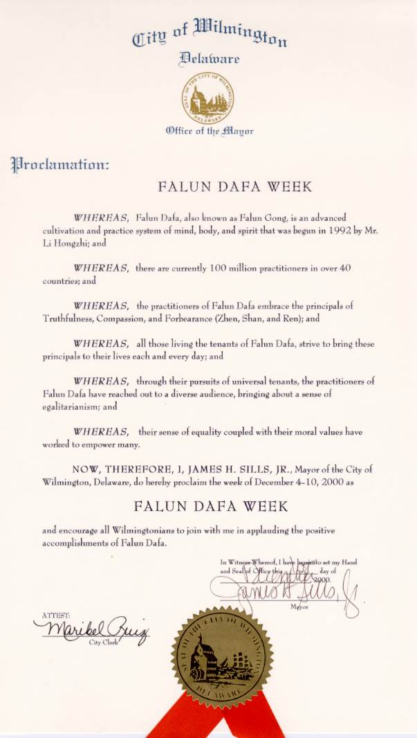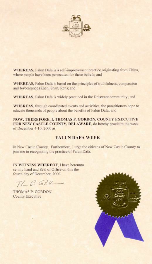 特拉华州州长和副州长签署对法轮大法的褒奖令