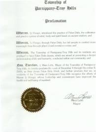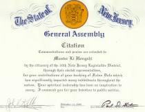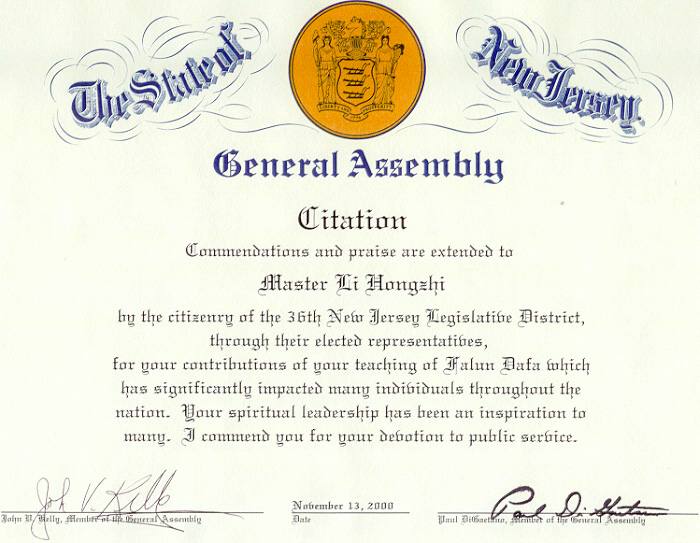 众议员John Kelly 先生和Paul DiGaetano先生在嘉奖令中写道:“新泽西州第36选区的全体人民通过他们的当选代表,对李洪志大师传授对全国众多人民产生显著影响的法轮大法而做出的贡献予以嘉奖和赞扬。您在精神方面的领袖地位是对众多人民的一个激励。我们嘉奖您献身公共服务事业的精神。”
