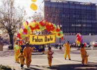队伍由天真活泼的小弟子们领队,由气球扎起来的拱桥十分醒目,接着是法轮大法中英文横幅,精美的图片记录了大法在海内外洪传的盛况,非常壮观。接着是衣着整齐的学员们利用机会向观众提供简单易学的动功师范。沿途不时爆出观众热烈的掌声,大法简介资料十分受欢迎,很多人伸长了手来索取资料,真是让人感受到向世人洪法与说明真相的紧迫感和必要性。