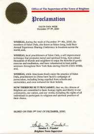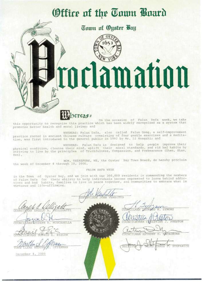 鉴于,自从一九九二年五月由李洪志先生传出后,在全世界已有上亿人,包括我们的社区和整个社会,在身体和心灵上从中受益,并且她的贡献得到了世界各地广泛的肯定和褒奖;