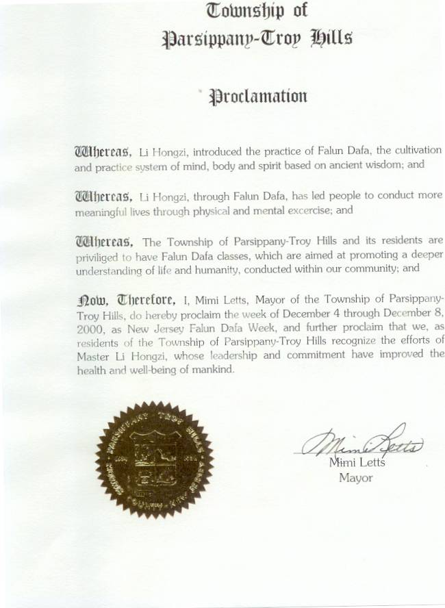 Mimi Letts女士在“法轮大法周”的公告中还赞扬了李洪志大师的领袖地位和奉献精神而使全人类的健康和福祉得以改善。她还表示“帕瑟伯尼市及其市民有幸在我们的社区中开有能加深对生命和人类理解的法轮大法学习班。”