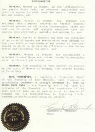 “李洪志大师通过无私和辛勤的努力而使他人受益。他把能使人们身体,精神和心灵诸方面得以改善的舒展平和的功法传授给来自各社会背景,各种族,各文化背景的人民。”