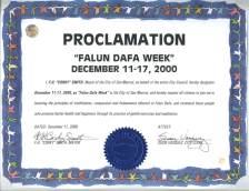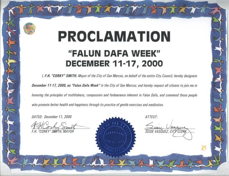 【明慧网2000年12月7日】 南加州圣玛尔科斯市宣布2000年12月11日至17日为“法轮大法周”