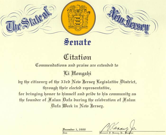 新泽西州33选区参议员为李洪志大师颁发嘉奖令