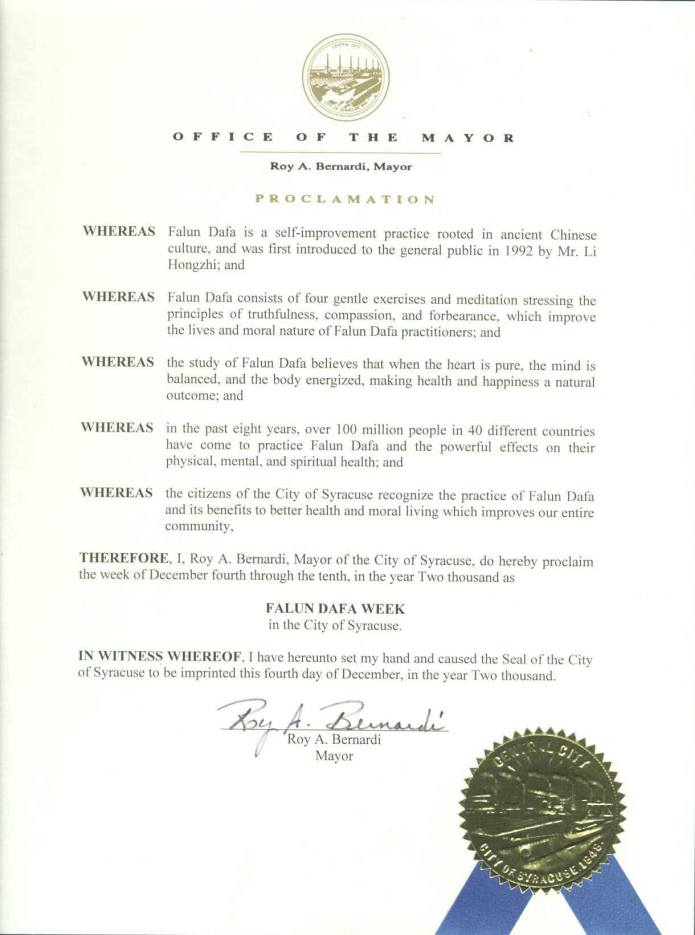 【明慧网2000年12月9日】纽约州锡拉丘兹市市长宣布2000年12月4日至10日为“法轮大法周”