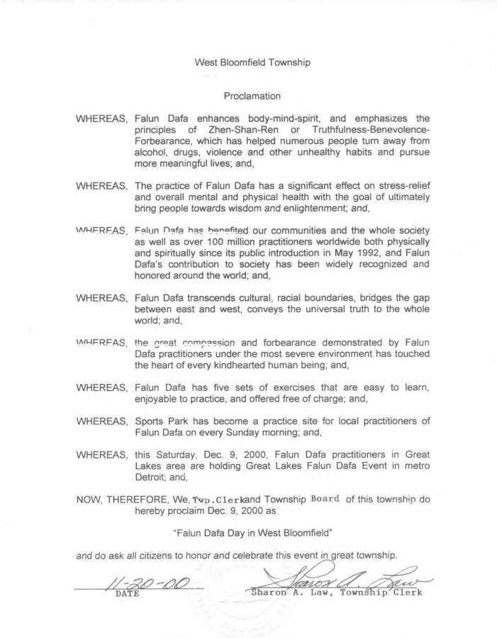 为此, 市议会及市政人员郑重宣布2000年12月9号为“西布罗姆菲尔德市法轮大法日”并鼓励所有市民赞誉并庆祝这一活动。