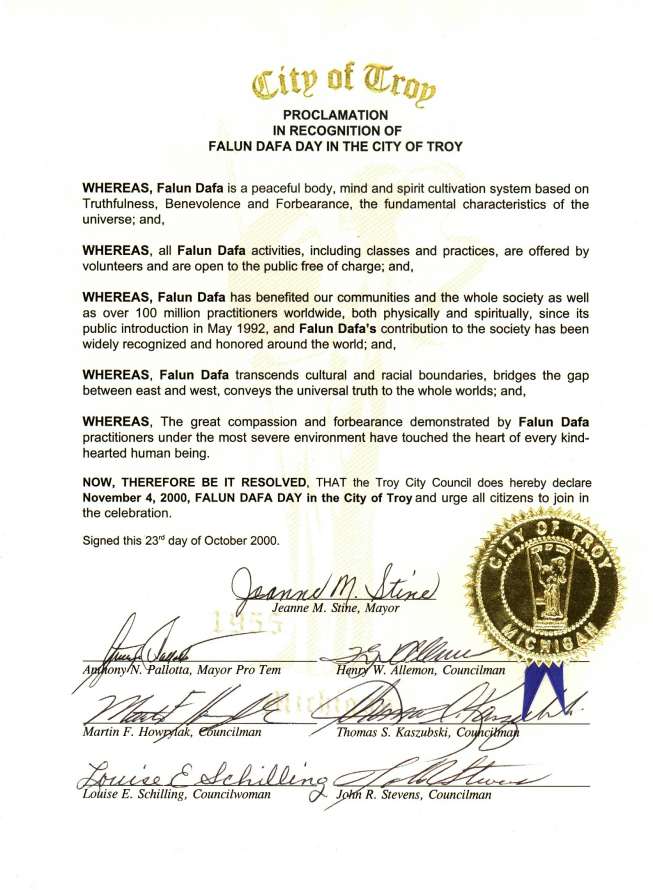 所以特罗伊市市议会宣布2000年11月4日为特罗伊市法轮大法日并敦促所有市民加入这一庆典。
