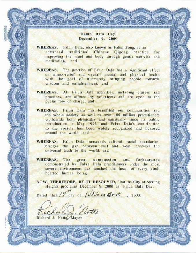 为此,经论鉴,斯特灵市特宣布:2000年12月9日为“法轮大法日”。