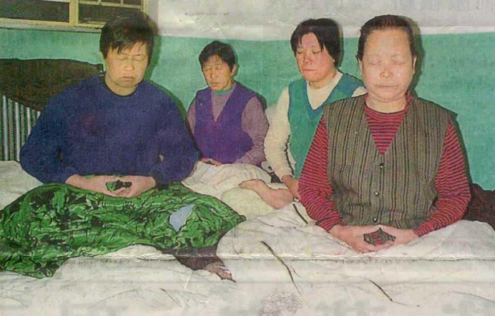 据法轮功学员提供给法新社记者的偷拍图片显示,被囚的法轮功学员坐在床上闭目练功。