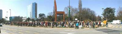 对比是非常鲜明的,人群悄然无声,站在万国广场上面对联合国的所在地,亚洲人、西方人排列整齐。周围 车辆喧嚣而行。在这个星期一的早晨,清冷但是有阳光。500名法轮功修炼者以他们的方式谴责中国对于宗教信仰自由的镇压和对法轮功修炼者的逮捕。