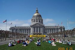 美国旧金山湾区的法轮大法学员于2000年4月25日中午在旧金山市政广场举行集体炼功,纪念中国法轮功学员中南海和平请愿一周年。法轮大法大旗在阳光下显得分外灿烂夺目。多家中外媒体前来采访。上图为学员们伴随着祥和悠扬的大法音乐做第五套功法--神通加持法。