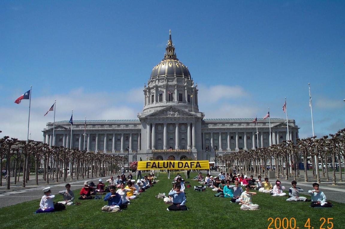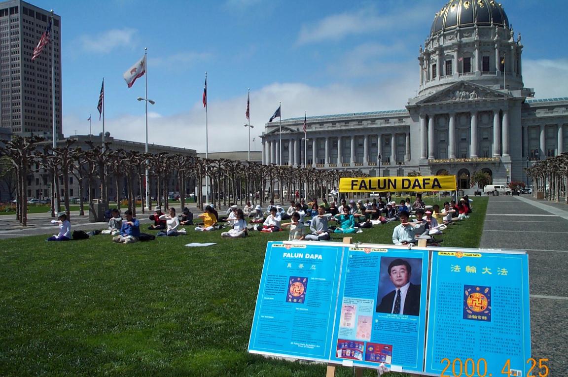 图片说明:美国旧金山湾区的法轮大法学员于2000年4月25日中午在旧金山市政广场举行集体炼功,纪念中国法轮功学员中南海和平请愿一周年。法轮大法大旗在阳光下显得分外灿烂夺目。多家中外媒体前来采访。上图为学员们伴随着祥和悠扬的大法音乐做第五套功法--神通加持法。