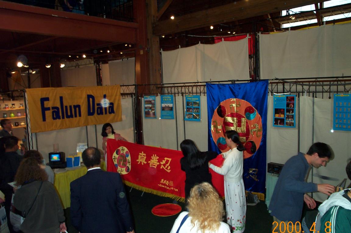 图片说明:美国旧金山湾区学员参加当地的健康博览会介绍法轮大法。上图为参展学员在布置会场。