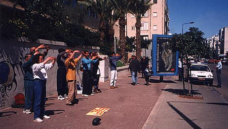 3月30日,以色列法轮功学员在中国驻以大使馆对面的街道上弘法