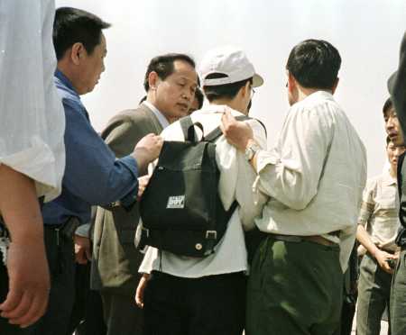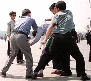 整个早上,天安门广场一片混乱景象,数百名警察和便衣人员忙着镇压广场各处的小规模抗议行动。