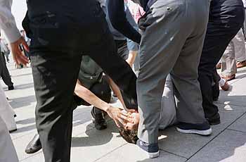 一名男子在遭便衣公安痛殴的同时,不断叫喊着:「我正在练习法轮功,你们怎能这样对付我?」