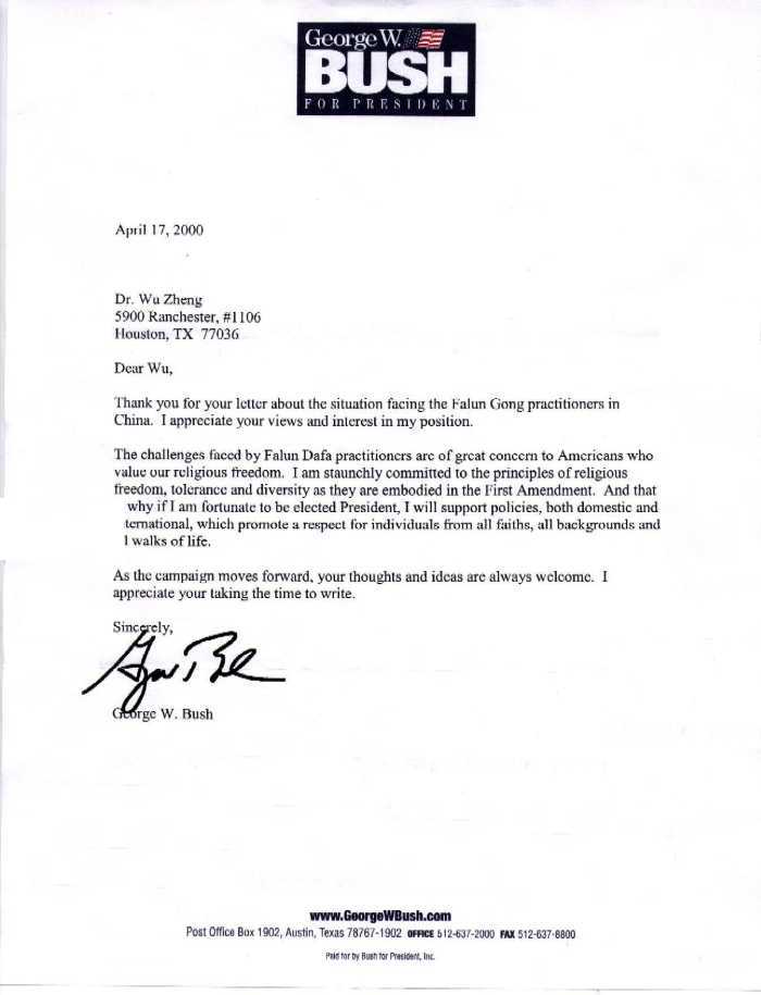 美国总统候选人乔治.布什致法轮功学员郑博士的一封信