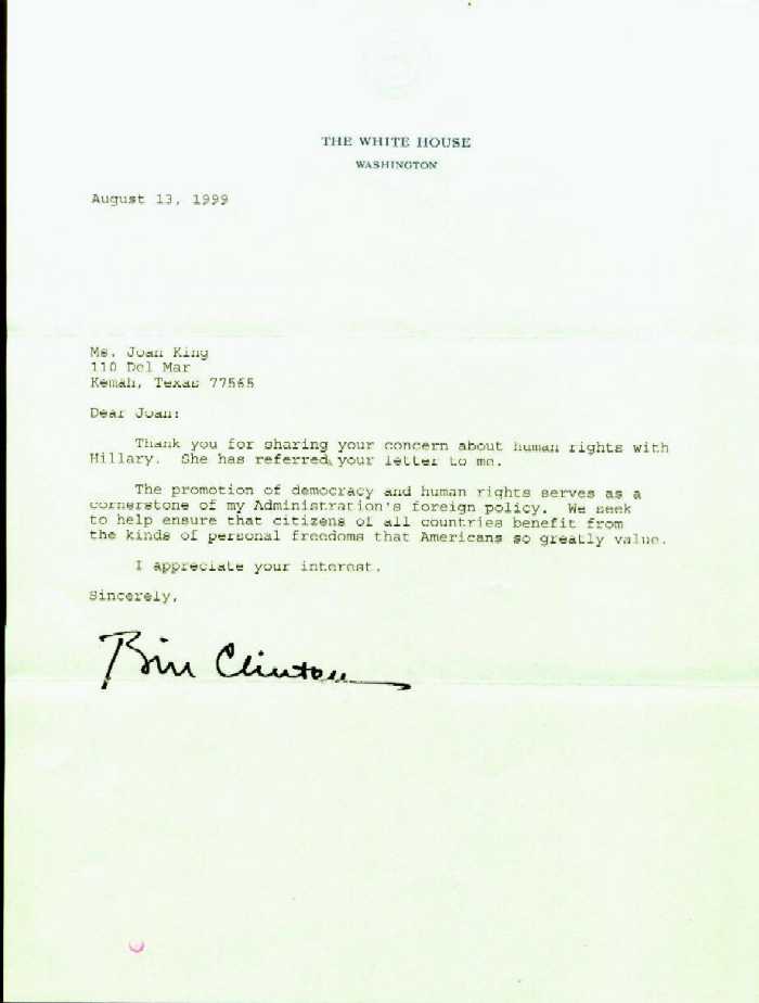 谢谢你与希拉里分享你对人权的关注,她已把你的来信转交给我。