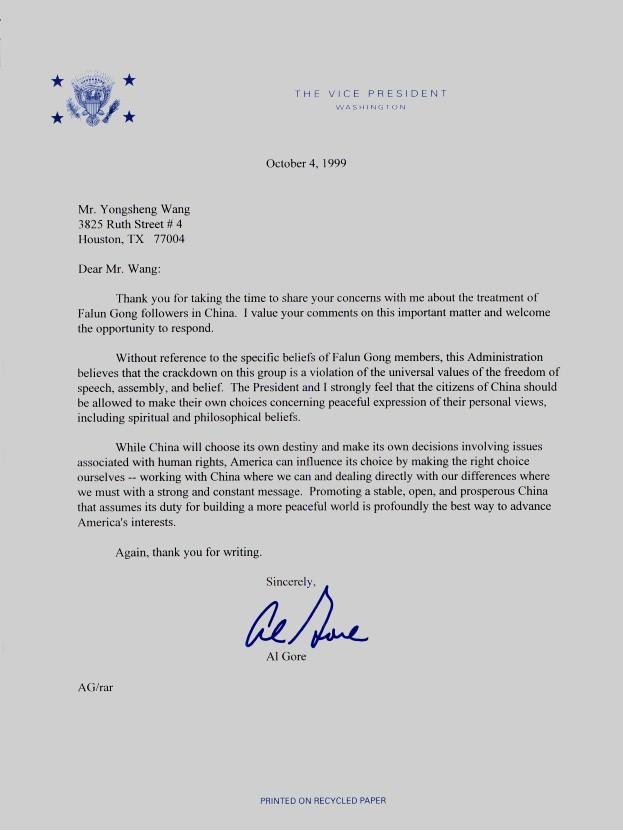 美国副总统高尔致法轮功学员王先生的一封信