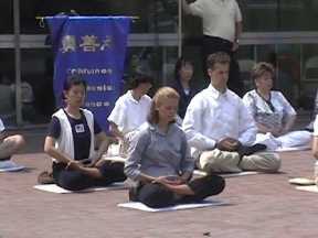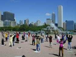 五月十三日,经过了几天风雨冲刷后的芝加哥显得格外洁净而又妩媚娇艳。在蓝天白云映衬下的密西根湖更令人心旷神怡。清晨,大芝加哥地区的学员从四面八方纷纷汇集到市中心著名的白金汉喷泉广场。在晨风中拉起了“法轮大法”和“真善忍”等横幅,法轮大法学员们在祥和而又庄严的气氛中炼功。