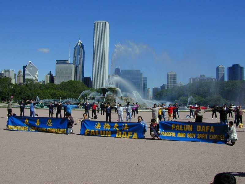 【明慧网2000年5月17日】五月十三日,经过了几天风雨冲刷后的芝加哥显得格外洁净而又妩媚娇艳。在蓝天白云映衬下的密西根湖更令人心旷神怡。清晨,大芝加哥地区的学员从四面八方纷纷汇集到市中心著名的白金汉喷泉广场。在晨风中拉起了“法轮大法”和“真善忍”等横幅,法轮大法学员们在祥和而又庄严的气氛中炼功。在这特殊的日子里我们向世人展现了法轮大法修炼人的风采。这种宁静的气氛象一块巨大的磁铁吸引着晨炼的市民和观光的游客。中西方的主要媒体也前来采访报道。专门拍摄芝加哥风光的摄影师前来抓拍这难以忘怀的场面。一群来芝加哥游玩的中学生兴奋地加入了我们炼功的行列,在学员的演示下炼起了“法轮周天法”。
