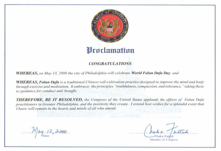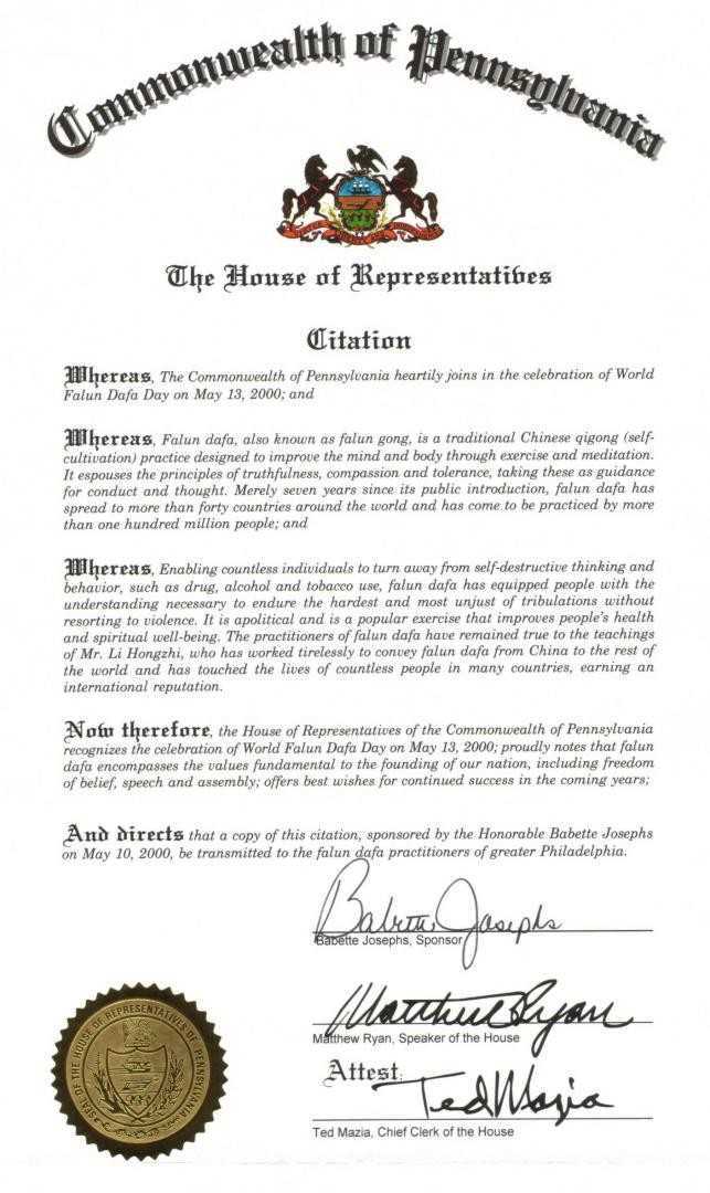 由此,宾夕法尼亚州众议院认同庆祝在2000年5月13日的“世界法轮大法日”,并骄傲地注意到法轮大法包含了我们国家成立的基本价值观念,这包括信仰,言论,集会自由。我们谨向未来年岁的继续成功而给与最美好的祝愿;并指定将此由荣誉的芭白特. 约瑟夫在2000年5月13日倡议的荣誉状副本交给大费城地区法轮大法修炼者们。
