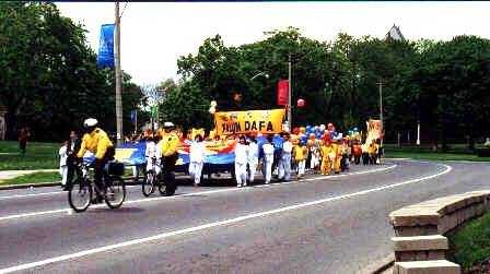 大法著作《转法轮》的大型模型在阳光下闪烁着光辉,数十条宽大的横幅耀眼夺目,由20名学员手托着的两个大型“法轮”图案随风舞动,彩球,小旗,各个国家和地区的标志把长长的游行队伍装点的分外绚丽。大法音乐“普度”和“济世”在队伍中回响。一份份大法宣传材料送到了围观的民众手里。人们的眼中充满了询问和惊奇。中英文报纸,电台和电视台的记者也赶来了。采访我们的学员,抓拍生动的镜头。为这即将过去的时刻添上新闻报导的彩笔。也许,人们还未意识到,他们所纪录下来的是多么珍贵的时刻!