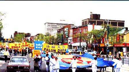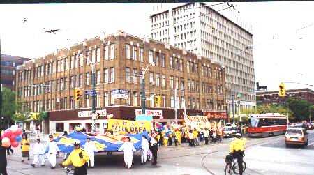 14日下午两点正,法轮大法修炼群众的游行队伍缓缓地从议会大楼后面的皇后公园走出来。经过学院街,然后浩浩荡荡地从热闹的中区中国城通过。