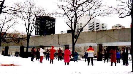 四点钟庆祝大游行结束了。部分学员又来到市政府广场前集体炼功。