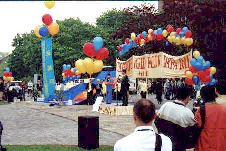 中英文写成的“庆祝世界法轮大法日”的横幅格外醒目,彩球将写着“真、善、忍”大字的条幅高高升起,两幅四十平方米的巨大的“法轮”图案展现在主席台的两侧,鲜花绿地中到处都有法轮大法弟子展开的横幅和彩球,大法音乐在会场上空回荡。