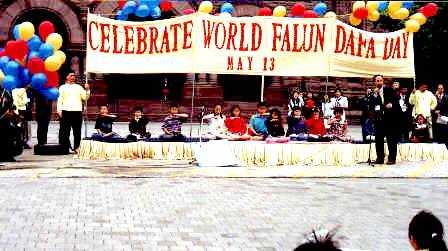 5月13日的清晨,加拿大多伦多刚刚经受了昨夜狂风暴雨的洗礼,淡淡的薄雾辉映着曙光的来临。当时针指向9点整,来自台湾,澳门,英国,新加坡,美国,中国大陆等国家和地区的大法弟子们与从加拿大各地赶来的大法弟子六百余人,汇集在多伦多议会大楼前,举行隆重的庆典。