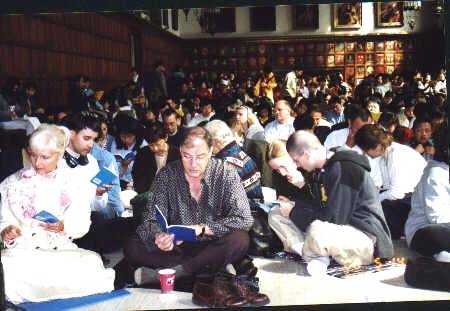 法会是在著名的多伦多大学圆形毕业大礼堂里举行的。主席台布置得和去年一样。就在去年的这个时候,就在这同一个主席台上,我们最尊敬的师父第二次为加拿大和其他远道赶来的弟子们讲法。