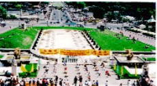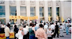 祥和的弘法场面吸引了众多的游人驻足。他们有的观看照片;有的拿取大法资料;有的和学员们交谈,打听学功的联系办法,了解法轮大法的内涵及中国国内迫害法轮功的情况;不少人主动在给各国际组织的请愿信上签字,表示对法轮功的同情与支持,对中国政府镇压这么平和的法轮功修炼者的行为表示不解和义愤。当场学功的人也不少。一位女孩儿一口气学完了五套功法,立即加入了集体炼功的行列,纹丝不动地打了半小时的坐。炼功结束后她表示感觉非常美妙,以后要去炼功点上和大家一起炼功。
