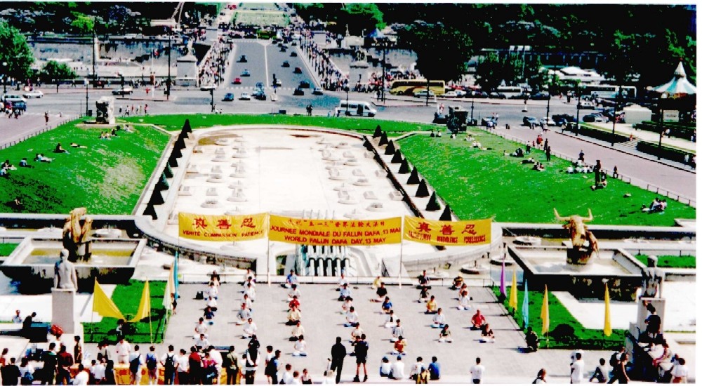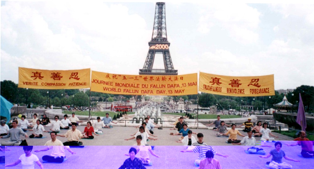 五月十三、十四日连续两天下午,巴黎的六十多位法轮大法弟子在埃菲尔铁塔对面游人众多的 Trocadero 喷水池边集体炼功、弘法。弘法场地上学员们拉开了“法轮大法”、“真善忍”、“庆祝五 . 一三世界法轮大法日”等横幅,插上了彩旗,竖起了介绍法轮大法的彩色照片,桌子上摆满了译成世界各国语言的大法书籍和介绍大法的资料,数十位中西学员随着炼功音乐,静静地炼功。