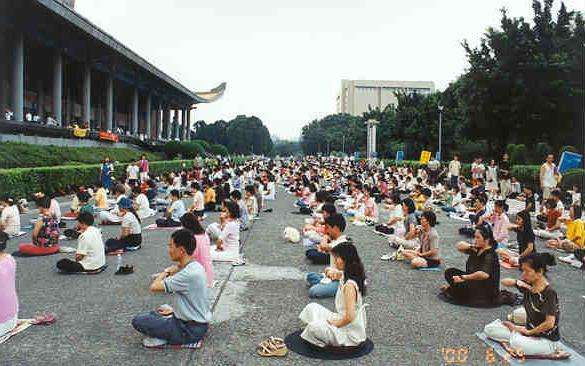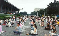 心得报告近下午三时许圆满结束。法会结束后,工作人员站在盛暑的街头,耐心微笑地指引弟子们有序地步行转往邻近的“国父纪念馆”展开大型的弘法炼功活动,数百人一行浩浩荡荡地来到人潮往来频繁的国父纪念馆。当场许多游客,不分老少,不分国籍,自四面八方向我们壮观的炼功场走近,工作人员娴熟地分工合作,有的发放中英文简介,老学员则安排现场教功,当场立刻有几十名游客加入学功的行列,学习专注的表情不下于学员;在炼功场的两端各摆放一台电视机,播放“真实的故事”、“法轮大法在台湾”及 师父的教功录像带,导正被中国政府歪曲的视听,吸引众多游客驻足观看,有的则仔细翻阅弘法架上摆设的大法书籍和大法简介陷入沉思,也有印度人,德国人,美国人当场向学员表达他们对于法轮功和平本质的理解,并表示有兴趣来了解已是世界知名的法轮功,整个弘法炼功的过程十分顺畅平和,时至傍晚,活动在沉暮中暂告结束,但弟子们心里都清楚修炼的进程会随著师父正法的神圣不止息地往前,直至“天清体透乾坤正,兆劫已过宙宇明”!