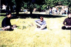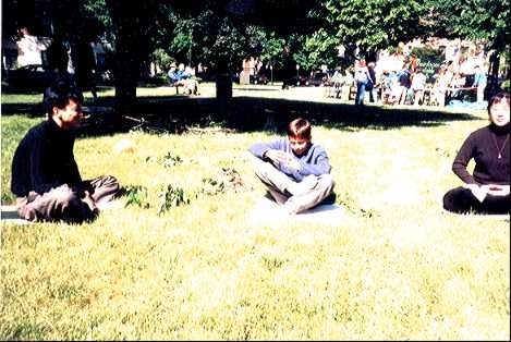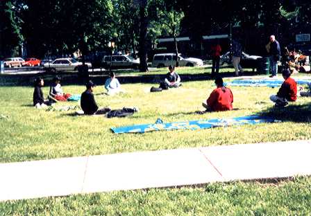 舒缓的动作,悠扬的中国音乐吸引了许多游人驻足观望。在交谈中我们了解到,游人中大部份对法轮功有所耳闻。有位老太太听了我的介绍后感叹道,在这个大陆上,金钱能办到任何事(money moves everything),而你们却讲为他人着想,讲“真,善,忍”,难能可贵啊。她表示以后一定要尝试法轮功。一位西北大学的新闻学教授对法轮功很了解,他与我讨论起了法轮功遭到镇压的原因。在学员们炼静功时,也有人前来对学员表示支持。一位白人小朋友还饶有兴味地模仿起学员们打坐来。不知不觉中,天空的阴云也一扫而空,灿烂的阳光普照大地。