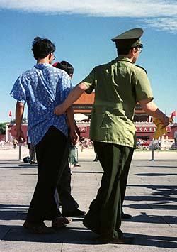警方现在能更有效地镇压天安门广场上的抗议。带着望远镜和步话机,他们可以很快地发现用双盘打坐来抗议的法轮功学员。几分钟之内,这些抗议的学员就被抓起来,拖到警车上拉走。
