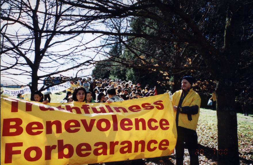 一周年后的今天,上午十点半钟,从纽省,维省和昆士兰省赶来的300多名学员聚集在堪培拉中国大使馆对面的草坪上,开始了一天的和平请愿活动。要求中国政府通过和平对话方式解决对法轮功的邪恶镇压;尊重宪法,尊重人权,停止对法轮功学员的关押逮捕;立即无条件地释放所有被非法监禁,关押的法轮功学员,还法轮功以清白。