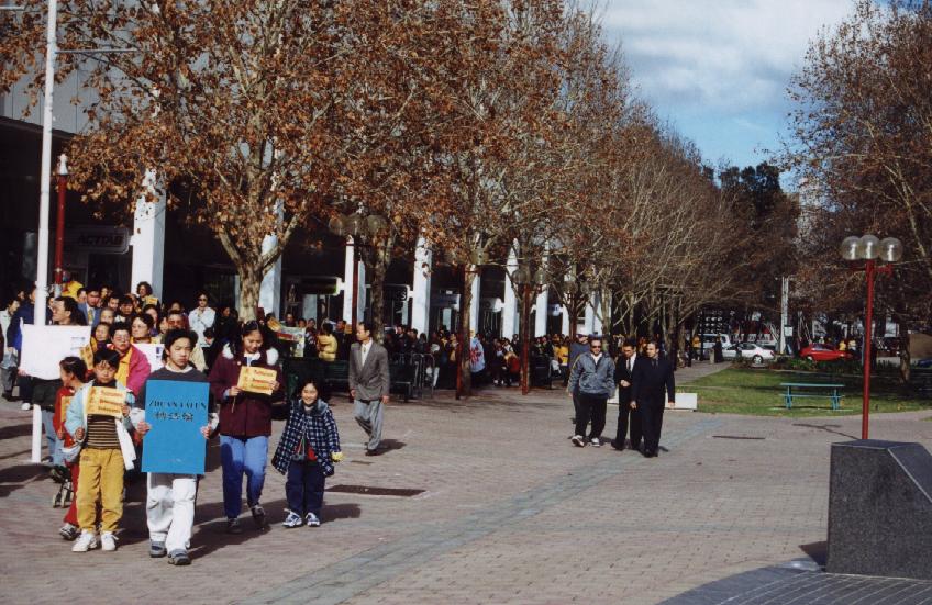 炼功结束后,学员们手持横幅,标语及宣传资料,从中国大使馆门前,开始了经由市中心长达五公里的和平请愿行走。参加此次活动年龄最小的是一位刚刚出生才11天的婴儿;还有一位仅差八天就是预产期的孕妇,在整个活动中和大家一起没拉下一步,包括五公里的请愿行走。沿途不少行人驻足观望,也有一些西人前来询问。学员们热情地向他们介绍了法轮功的详情及目前在中国发生的事,并送给他们资料,以便有缘人有机会进一步详细地了解法轮功真象。