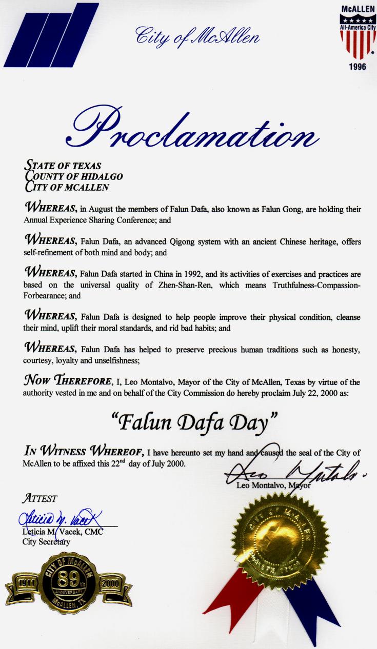 因此,现在,我,里奥·蒙特尔沃,德克萨斯州麦克·艾伦市市长以授予我的权力代表市政委员会宣布2000年7月22日为
